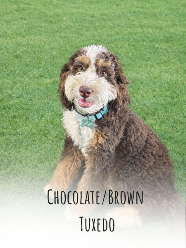 - Red, Red Tuxedo & Butterscotch – Warm tones ranging from deep red to golden butterscotch. Red Tuxedo Bernedoodles feature white markings on the chest, paws, and sometimes the face